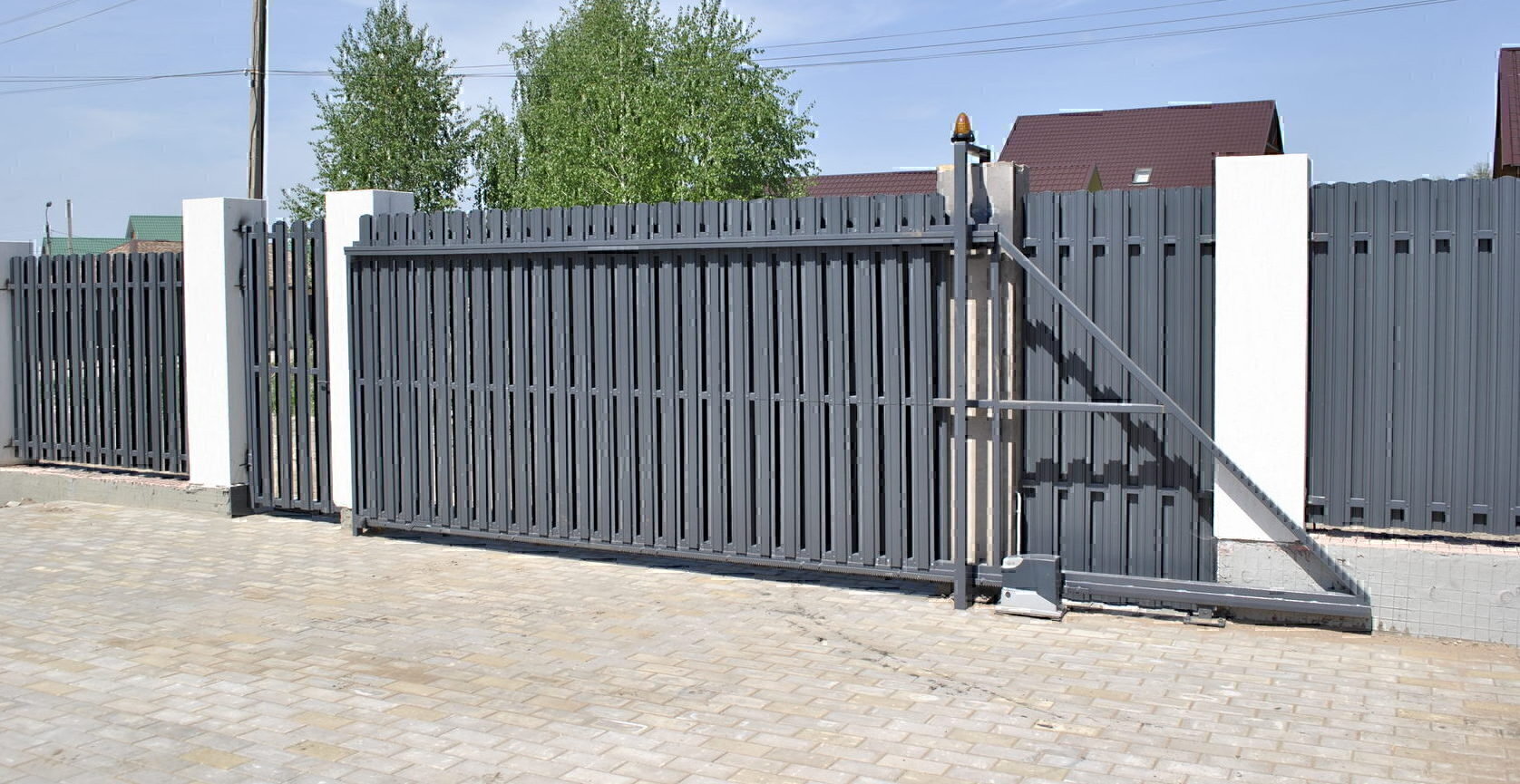 Откатные ворота из евроштакетника с встроенной калиткой и автоматикой